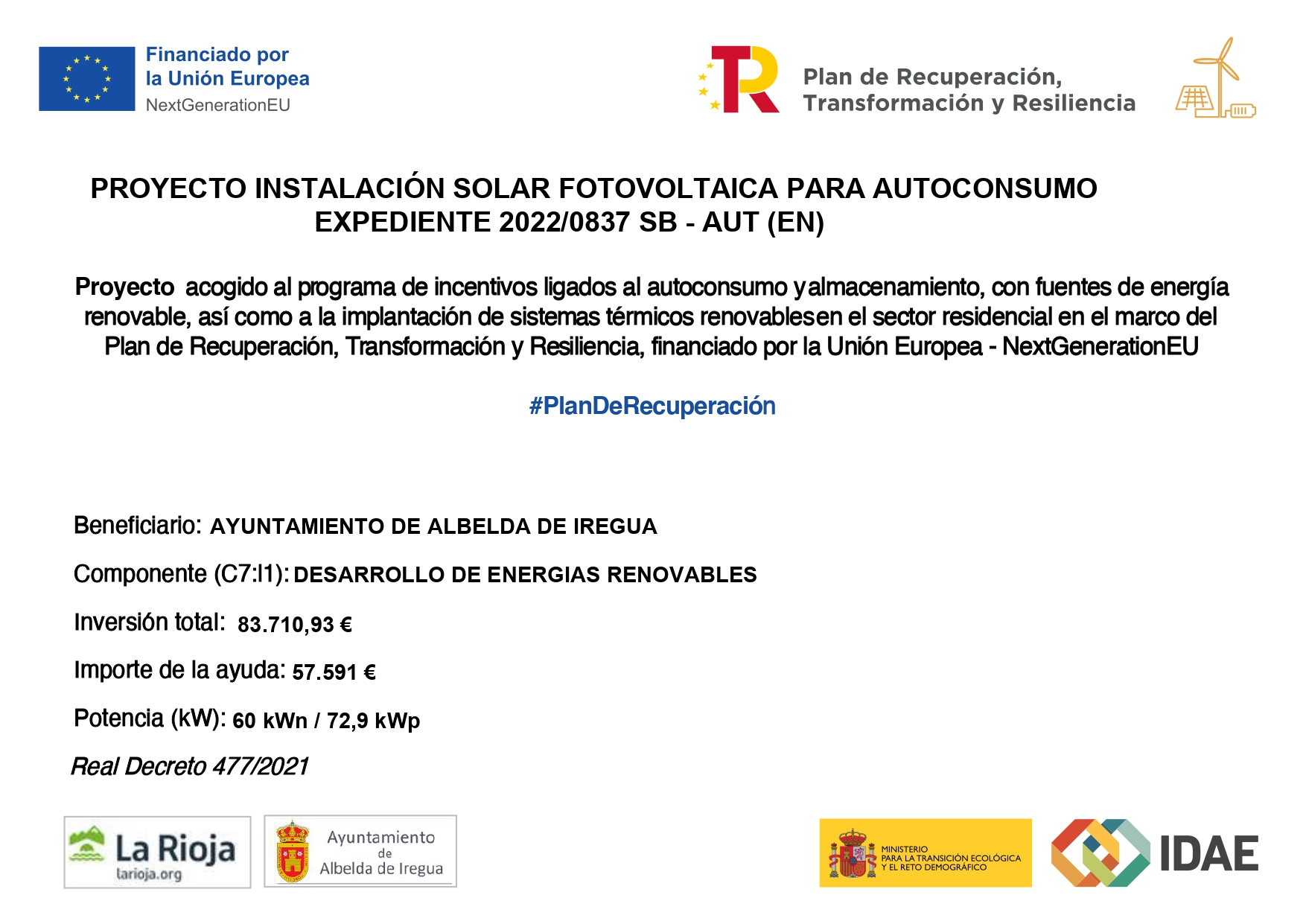 Instalación de placa solar para autoconsumo en la cubierta del Frontón municipal de Albelda de Iregua. Detalles 11 Noviembre 2025 DESCARGAR DOCUMENTO
